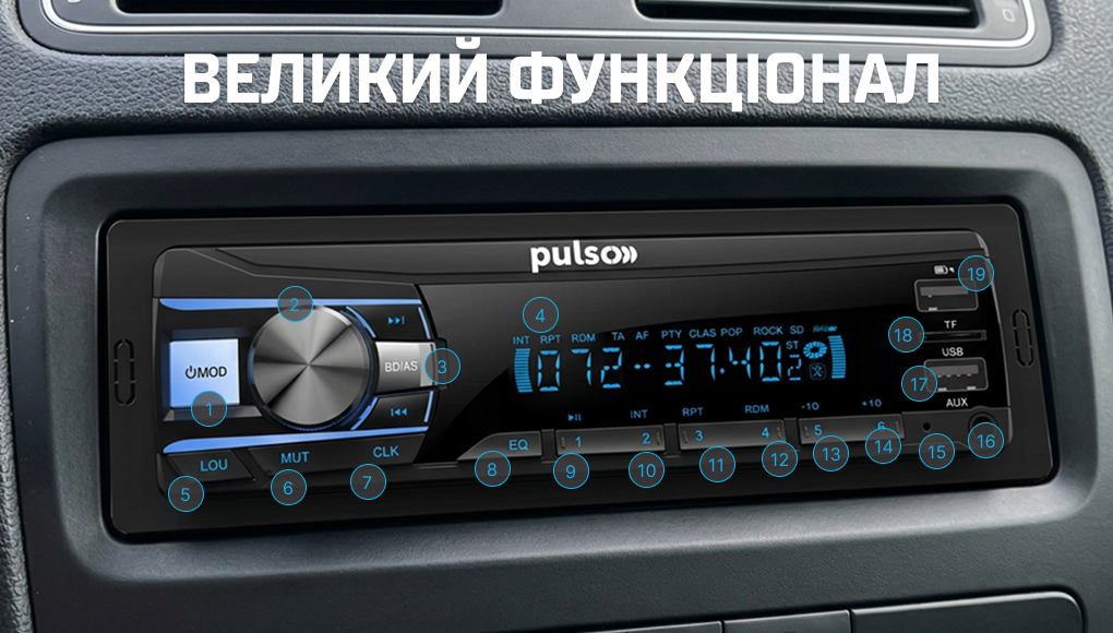 Автомагнітола Pulso з вбудованим FM-тюнером та функцією пам'яті на 18 радіостанцій для швидкого доступу до улюбленого контенту.
