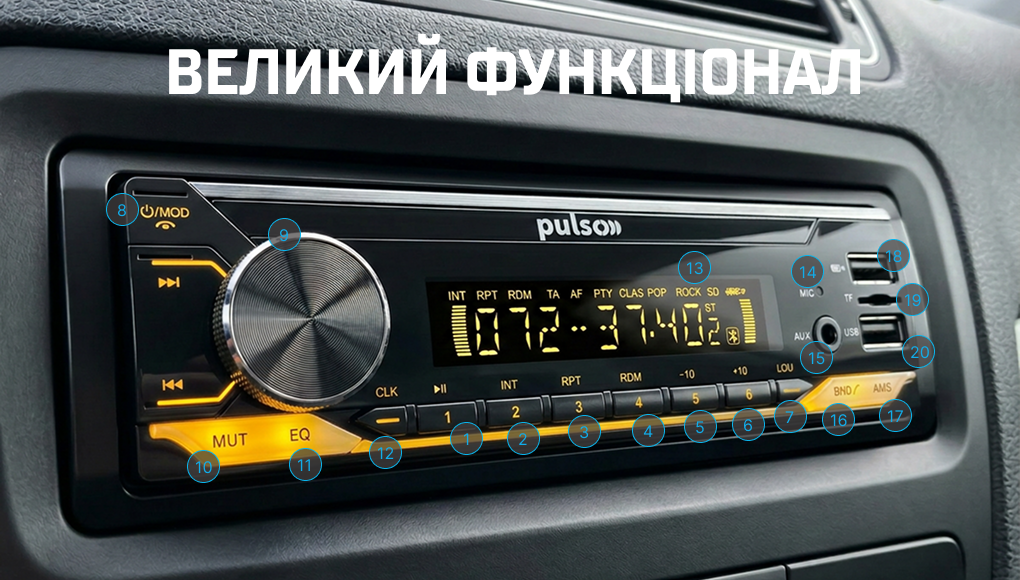 Автомагнітола Pulso з вбудованим FM-тюнером та функцією пам'яті на 18 радіостанцій для швидкого доступу до улюбленого контенту.