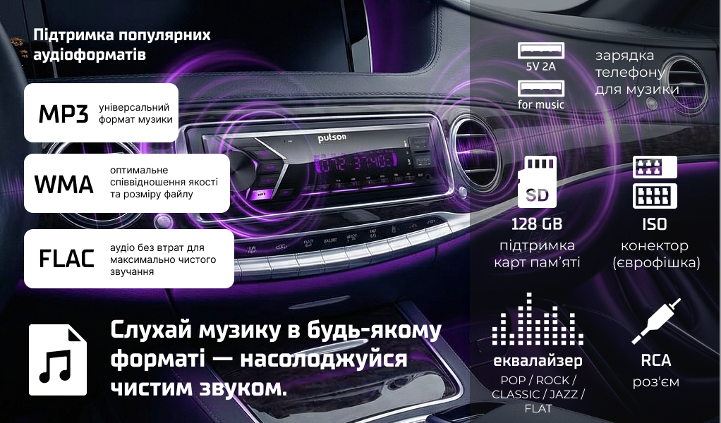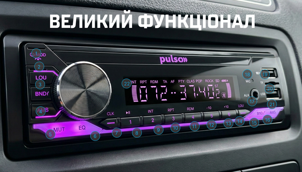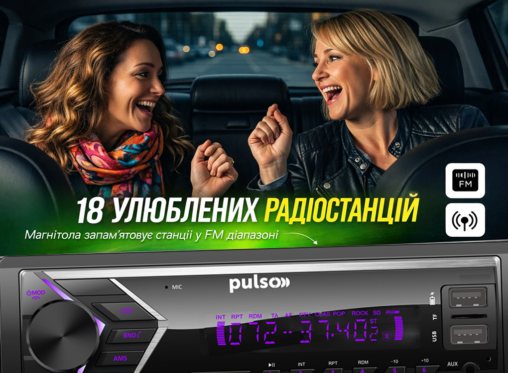 Автомагнітола Pulso з вбудованим FM-тюнером та функцією пам'яті на 18 радіостанцій для швидкого доступу до улюбленого контенту.